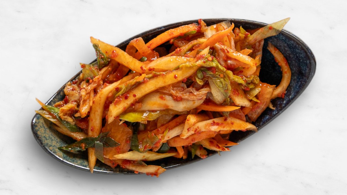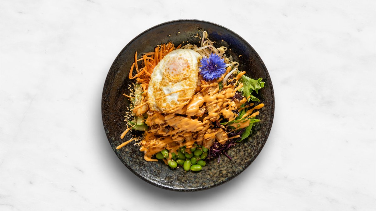 Morot, gurka, sallad, soyabönor kimchi, sjögrässalad, böngroddar, ris och chilisås topping stekt ägg och sesam. Tillval: Protein