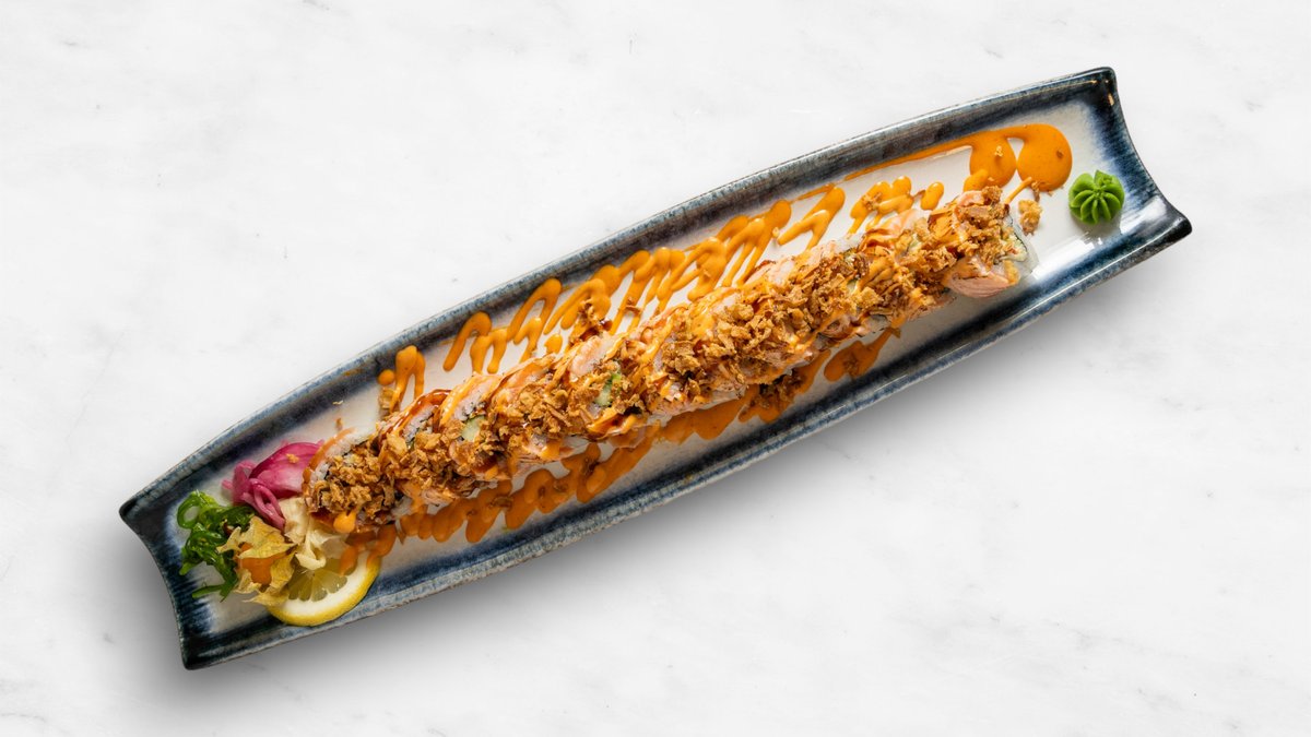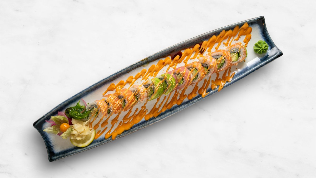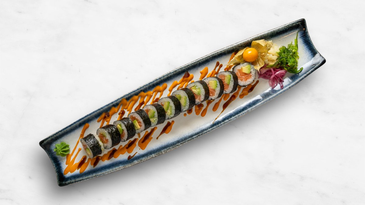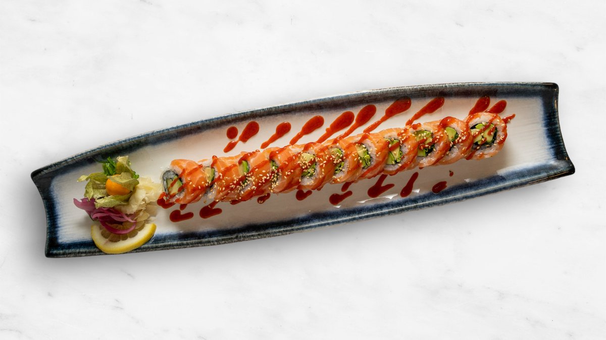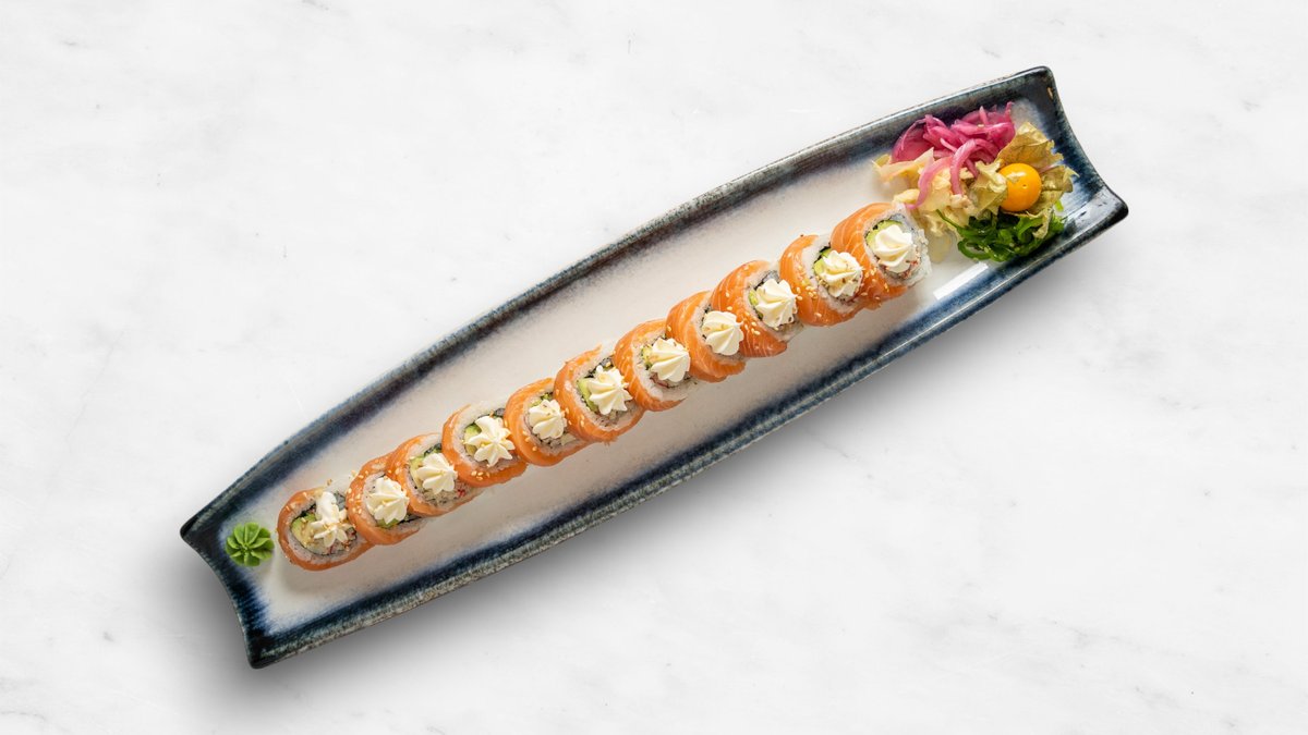 Gurka, avokado, philadelphiaost, räka, topping halstrad lax, chilimajonnäs, teriyakisås och rostad lök.