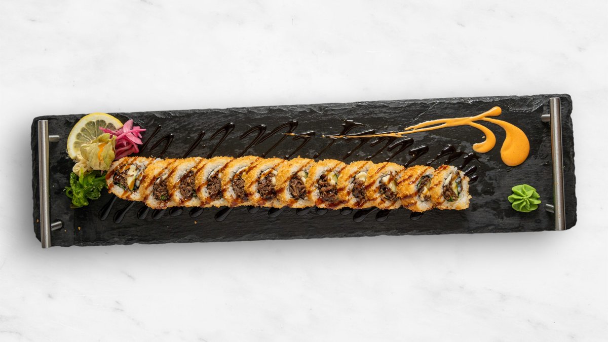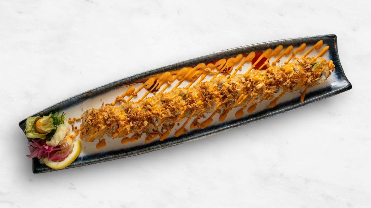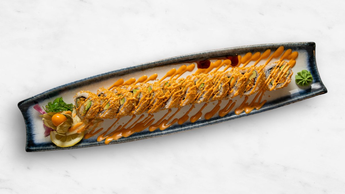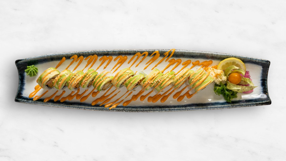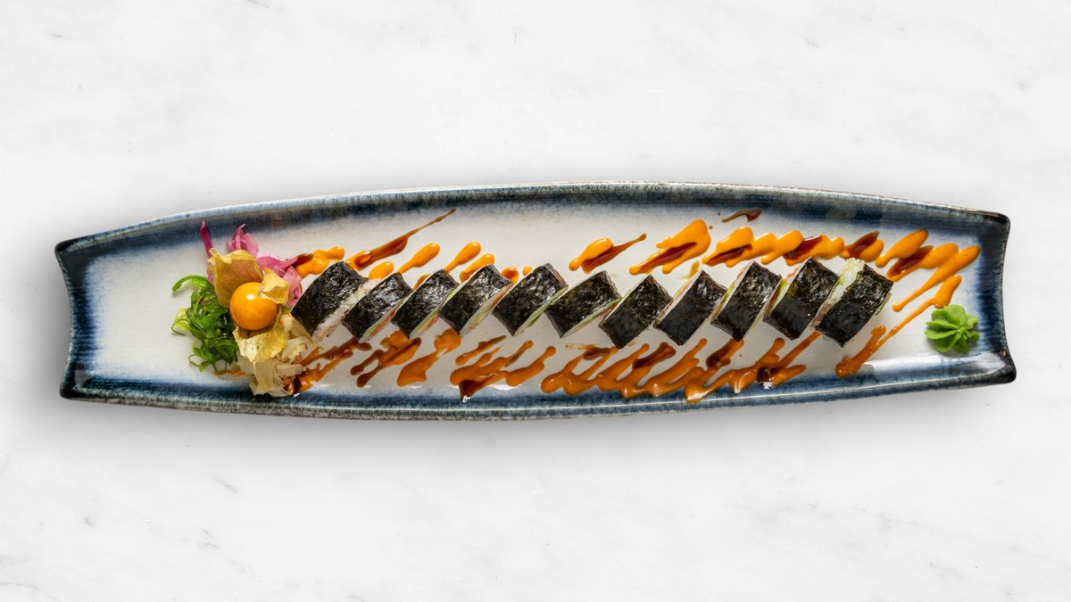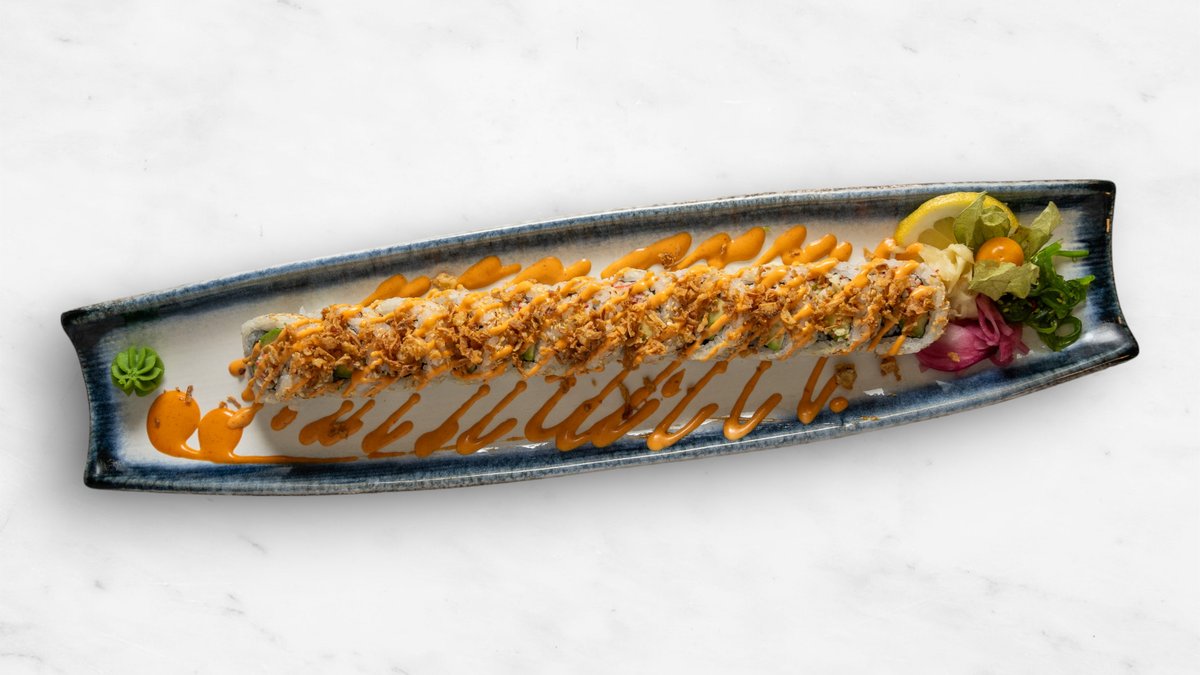 Gurka, avokado, philadelphiaost, räka, topping halstrad lax, chilimajonnäs, teriyakisås och rostad lök.