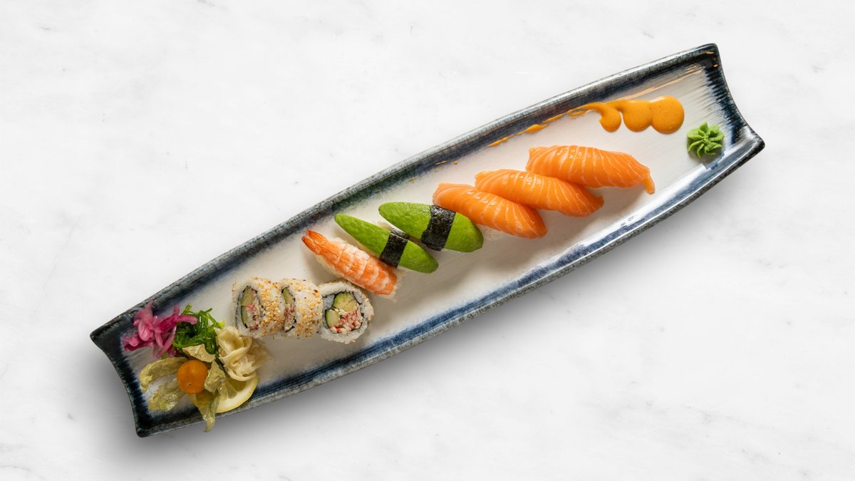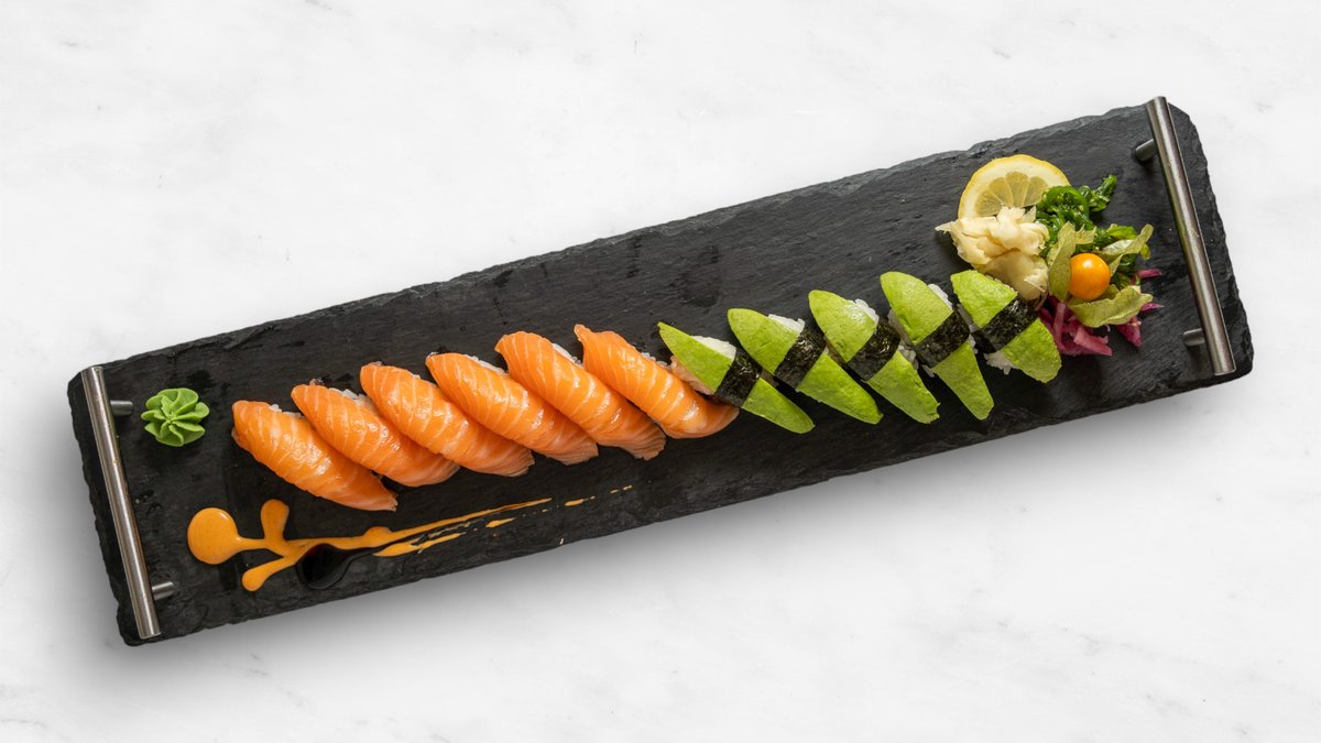 14 lax, 8 räka, 8 avokado, 10 flying salmon och 10 tempura ebi.