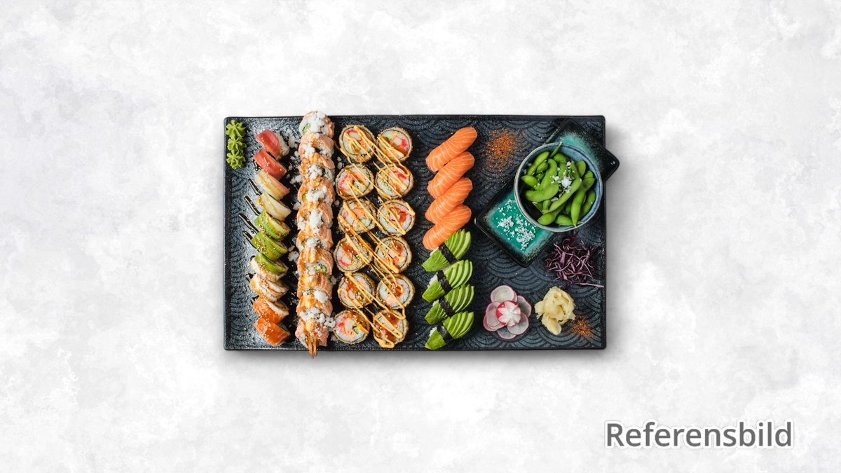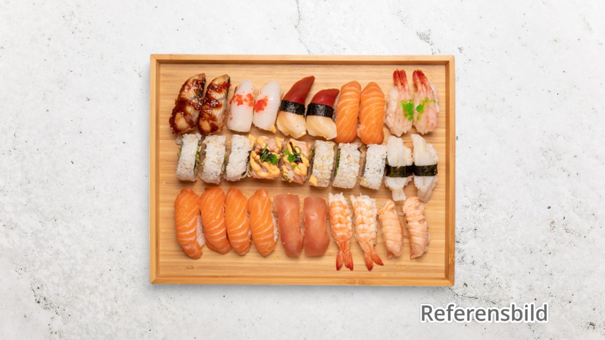 15 lax, 15 avokado, 10 räka, 10 tempura ebi och 10 special rullar.