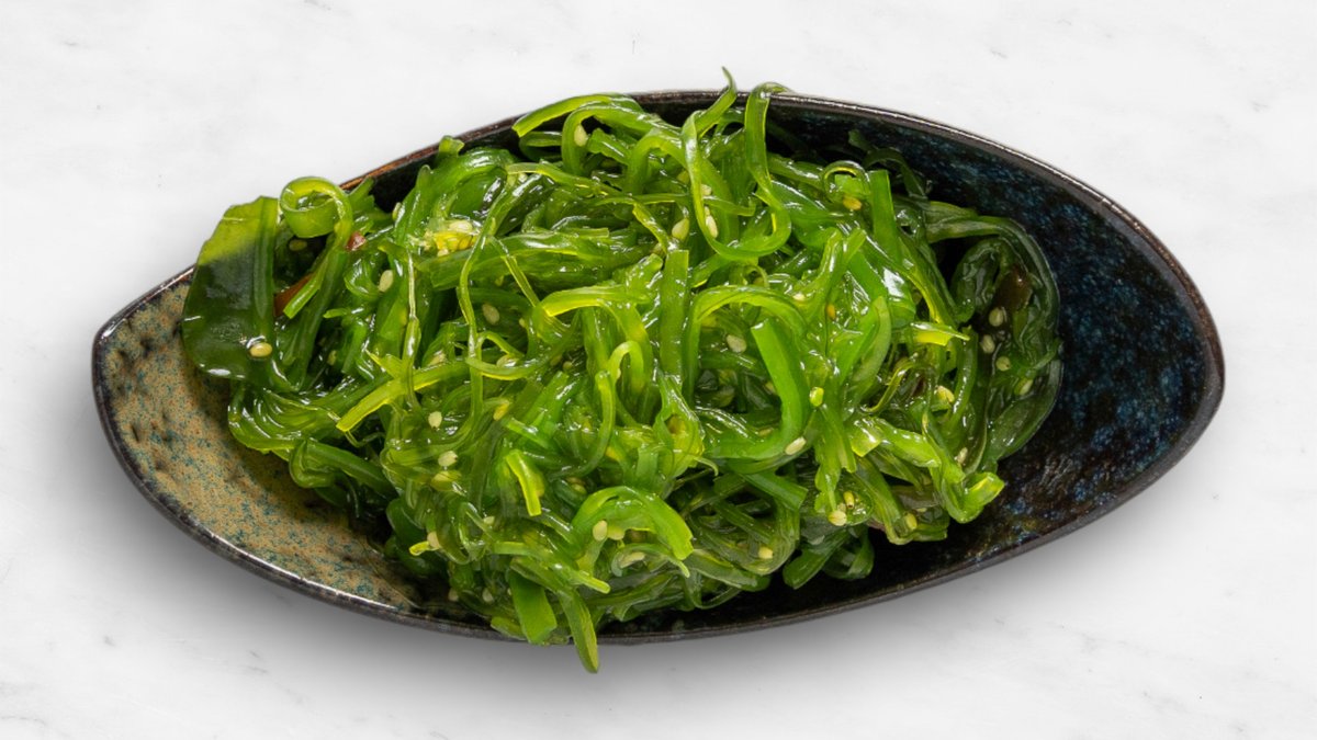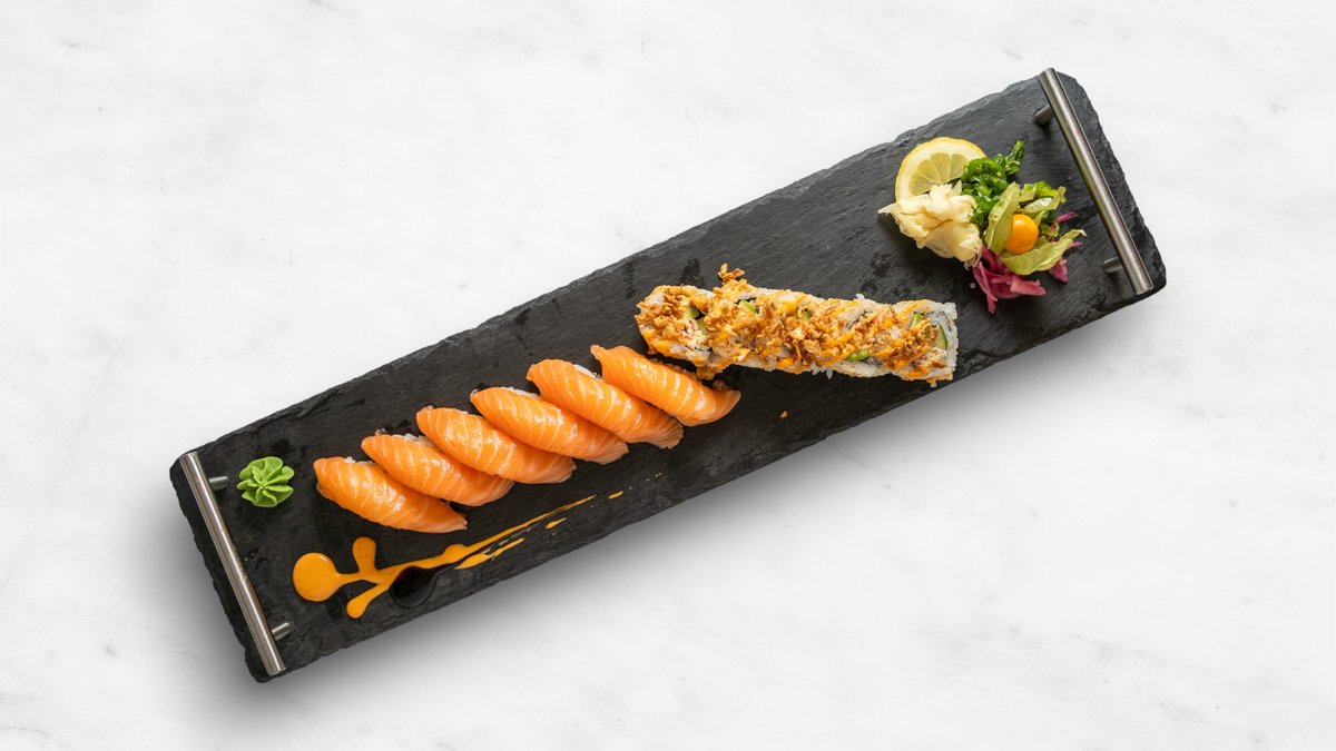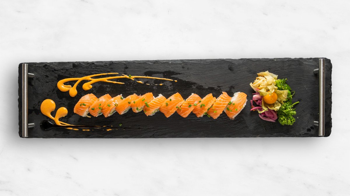 Gurka, avokado, seafoodröra, topping halstrad lax, teriyakisås, chilimajonnäs och rostad lök.