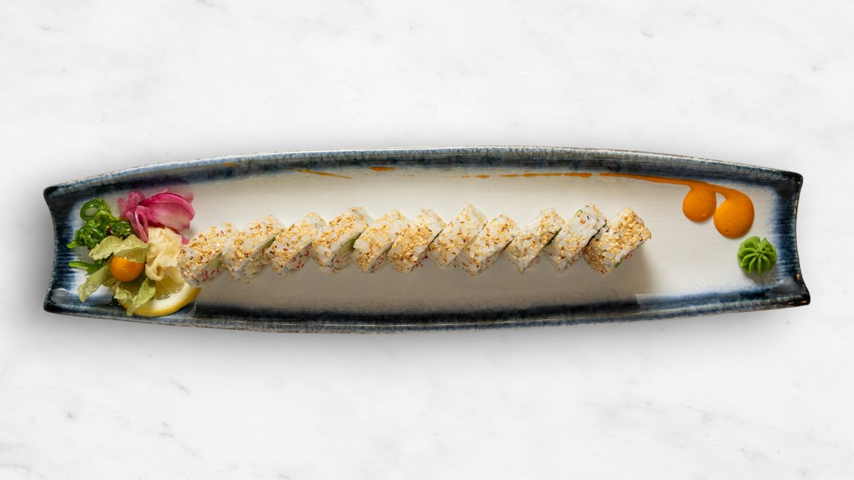 Gurka (friterad), avokado, seafoodröra, panerad med ströbröd.