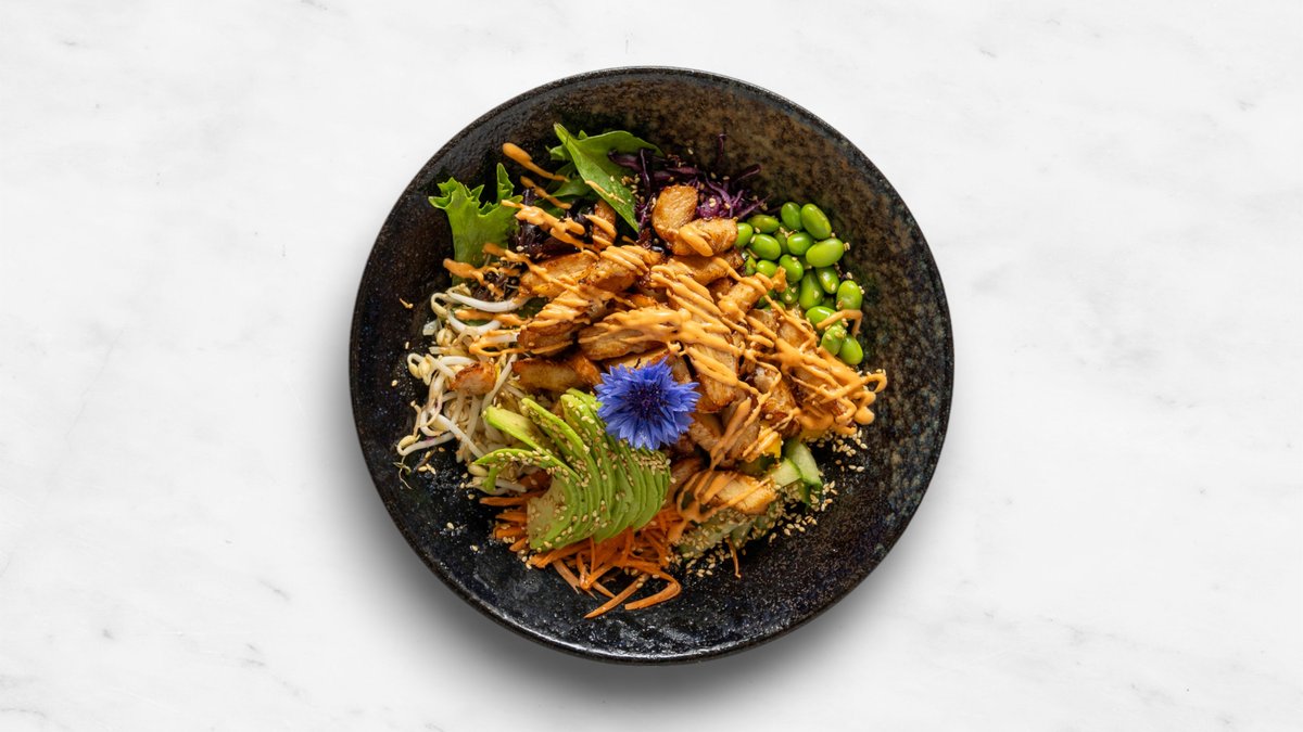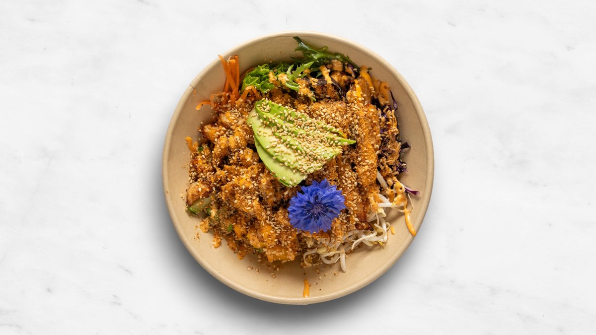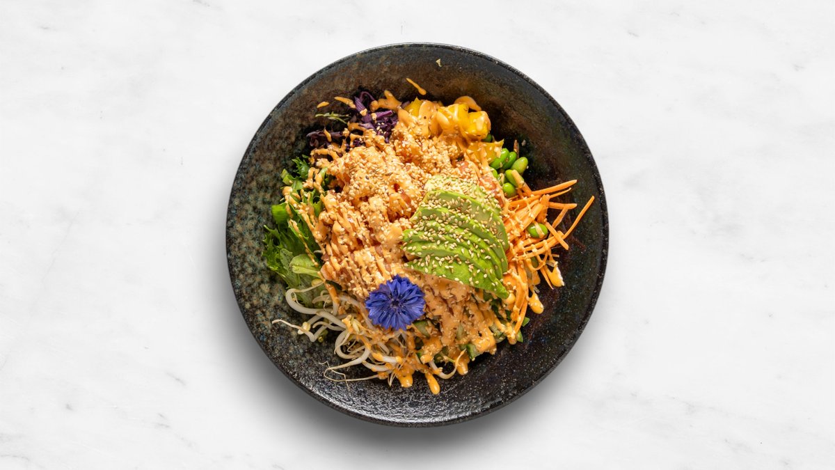 Ris, mango, sallad, gurka, morot, avokado, soyabönor, böngroddar, majs och rödkål. Tillval: Protein