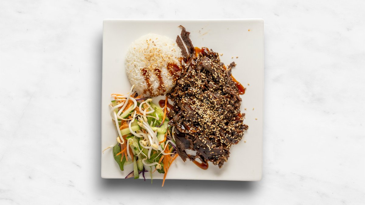 Skivat nötkött, jasminris, salladmix, teriyakisås och chilisås.