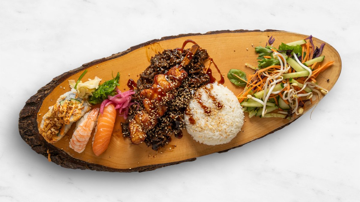 Skivat nötkött, kycklingspett, grönsaker mix, jasminris 4 bitar sushi, 1 lax, 1 räka, 2 rullar och chilisås teriyakisås.