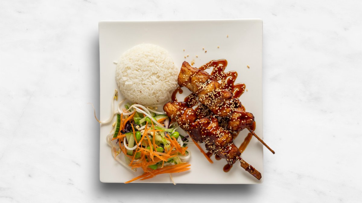 Kycklingspett, jasminris, salladmix, teriyakisås och chilisås.