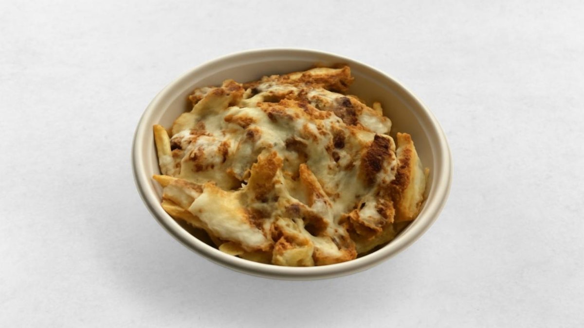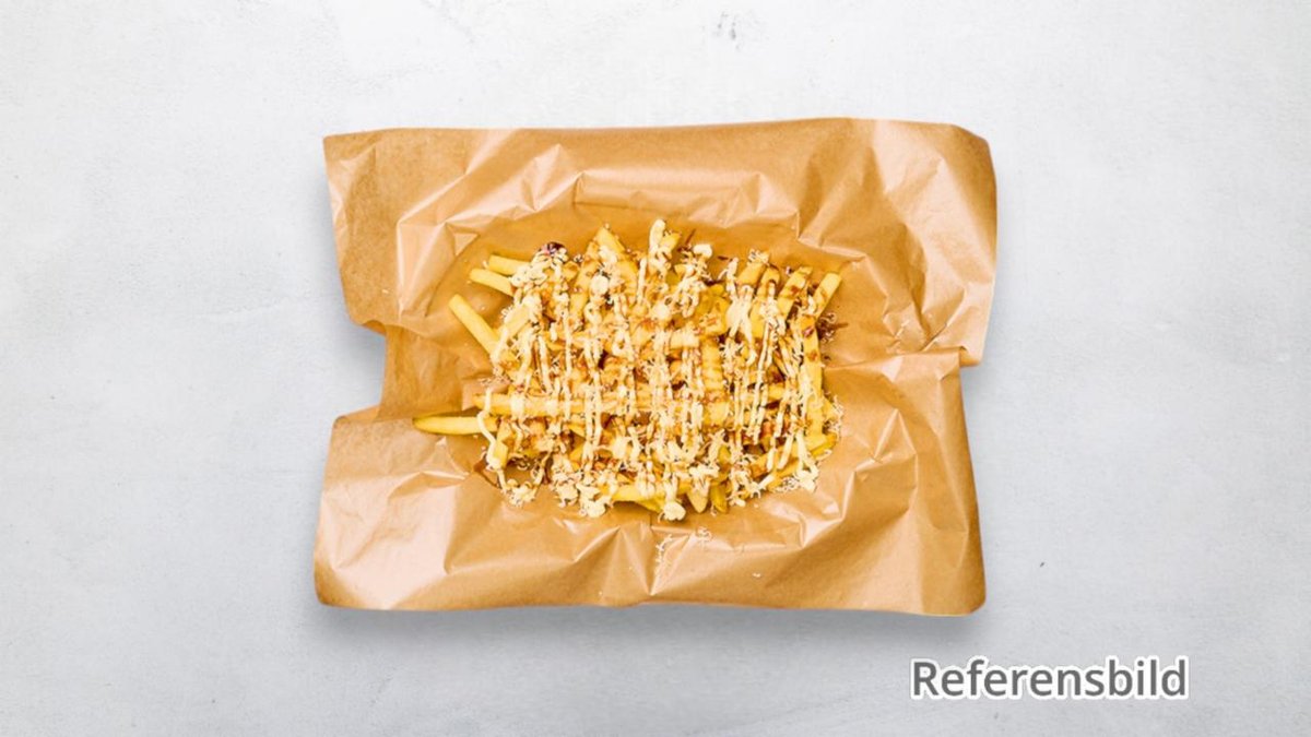 Schnitzel, pommes, nuggets, garlic pepper dressing, ketchup och smält ostsås. Med smält cheddarost och rostad lök ovapå Tillval: Välj Dryck, Extra Sås?